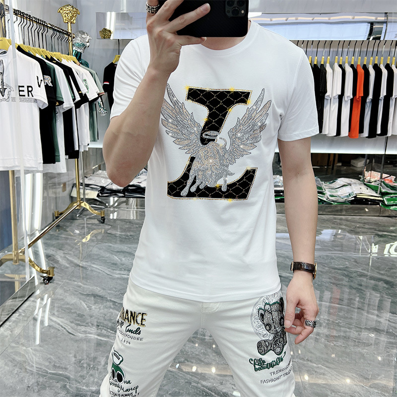 ¥45夏季新款烫钻短袖男欧洲站潮流圆领休闲个性修身透气薄款舒适T恤已有0+条评价机构名称3立即购买 -