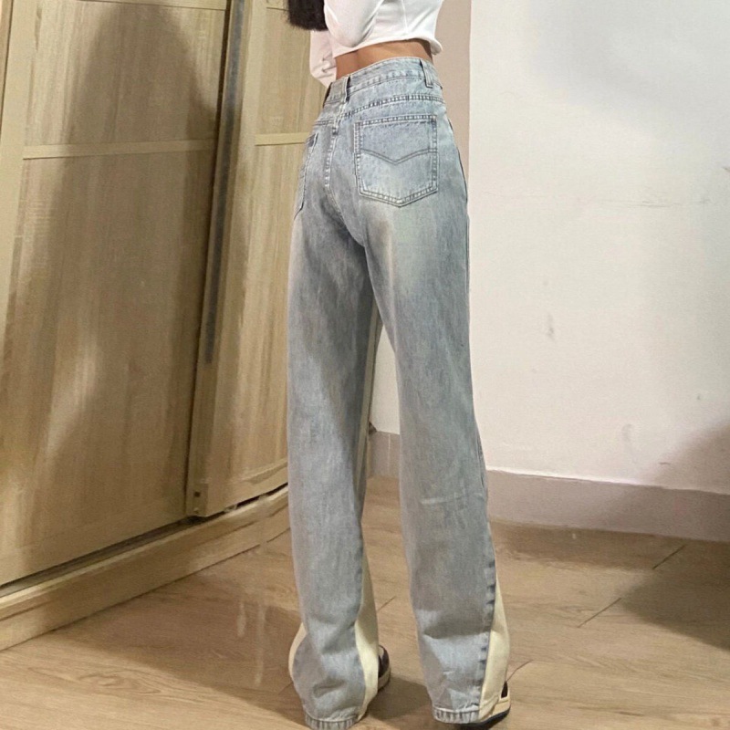 大码胖mm复古美式牛仔裤女春夏高腰直筒高街ins拼色阔腿长裤子潮