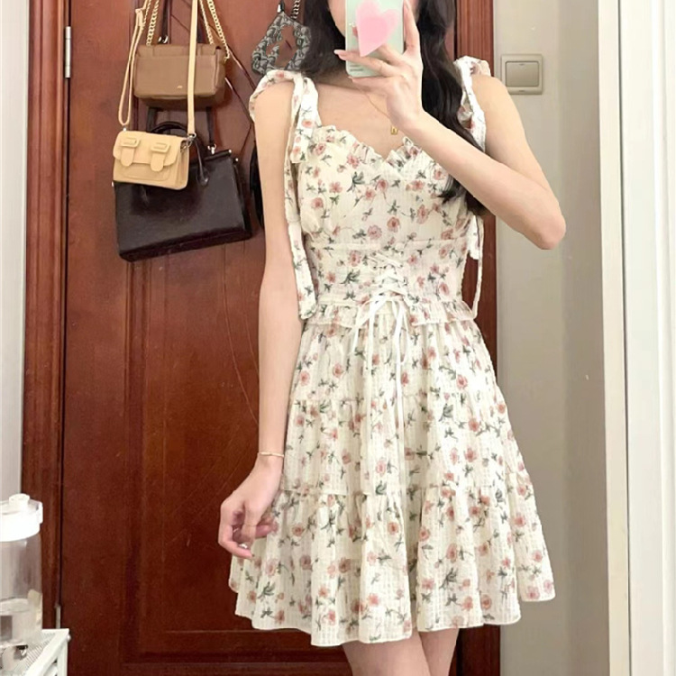 吊带碎花连衣裙子女夏季收腰显瘦甜辣设计感小众初恋茶歇法式