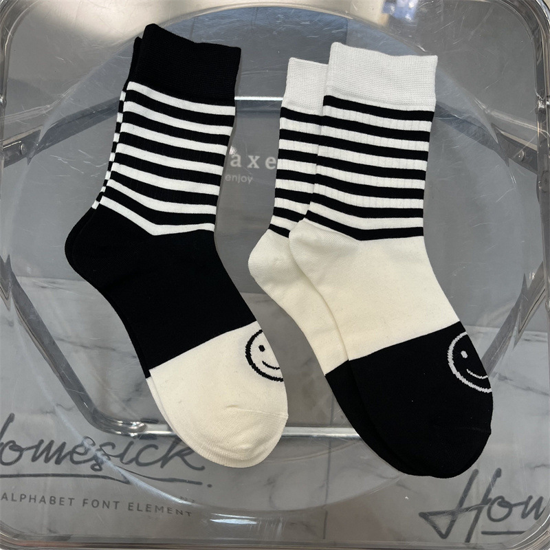 23夏季新款欧货袜子女个性ins潮袜小众拼接条纹笑脸薄款棉中筒袜