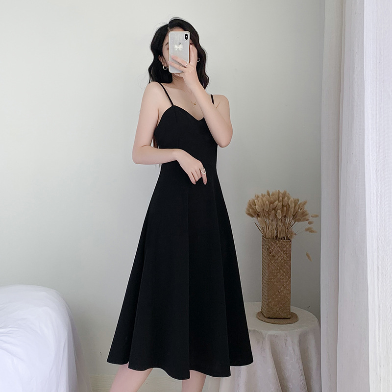赫本春夏法式黑色打底外穿收腰中长小礼服字吊带连衣裙小黑裙女