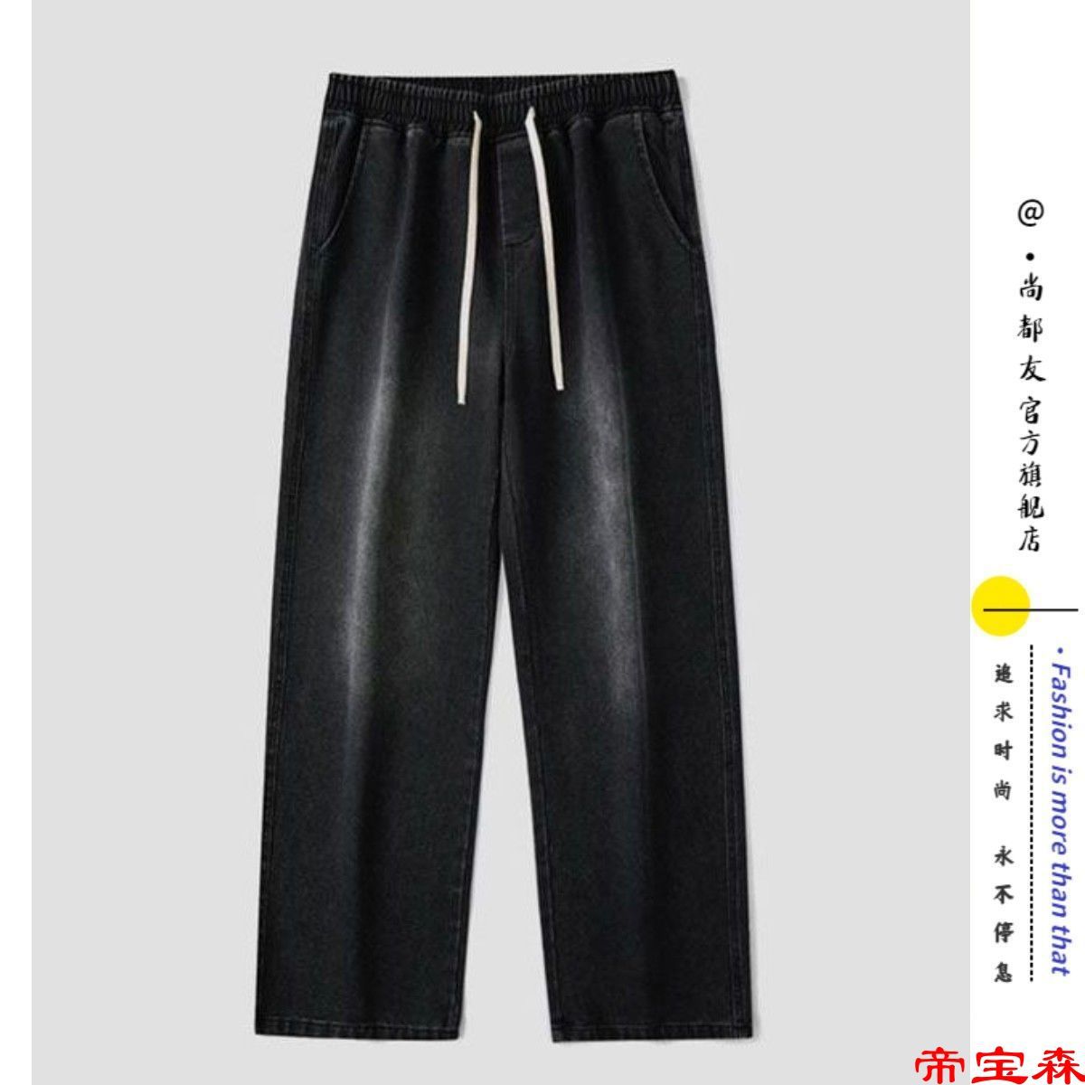 牛仔裤男女黑色宽松休闲秋季男生直筒裤潮流松紧腰垂感阔腿长裤子