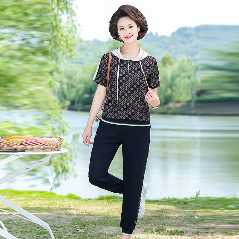 夏季新款妈妈装套装时尚休闲中老年女装连帽短袖减龄显瘦两件套