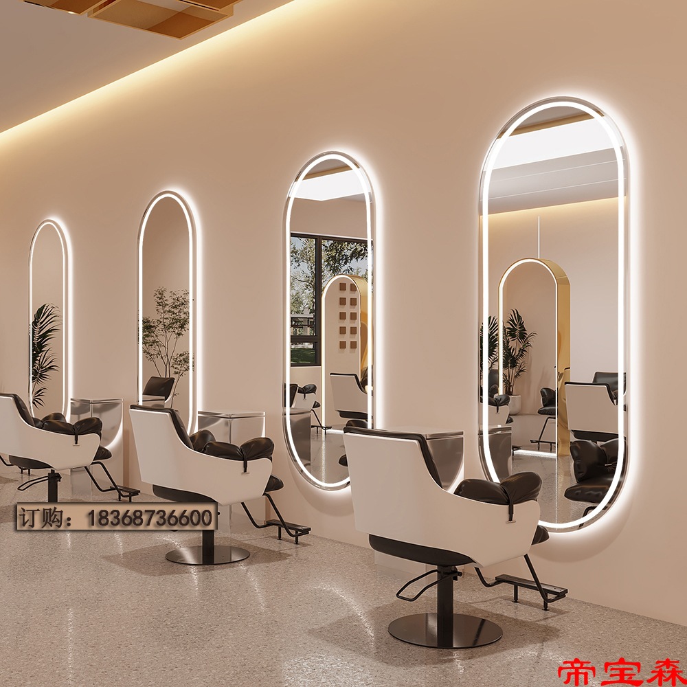 T网红新款理发店镜子挂墙美发镜台发廊专用带灯发光剪发烫染圆镜