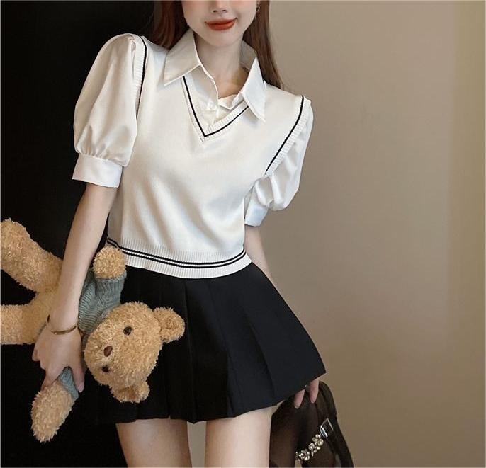 假两件泡泡袖针织衫女夏季2023年新款修身显瘦POLO领短款短袖上衣