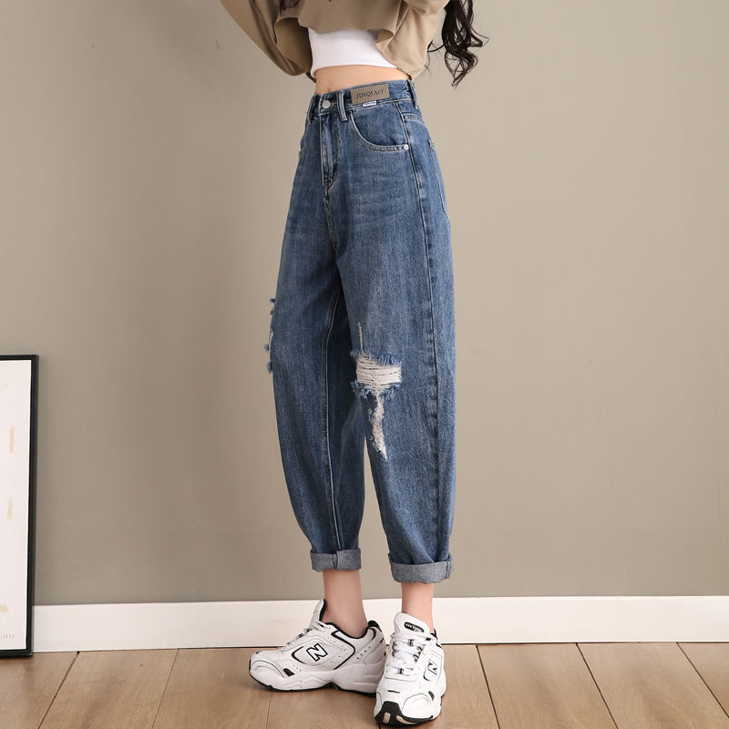破洞牛仔裤女士夏季2023年新款高腰大码宽松显瘦老爹萝卜哈伦裤子