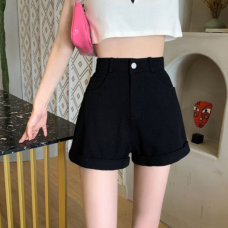 2023春夏新款玫红色牛仔短裤女小个子甜酷辣妹高腰卷边热裤阔腿裤