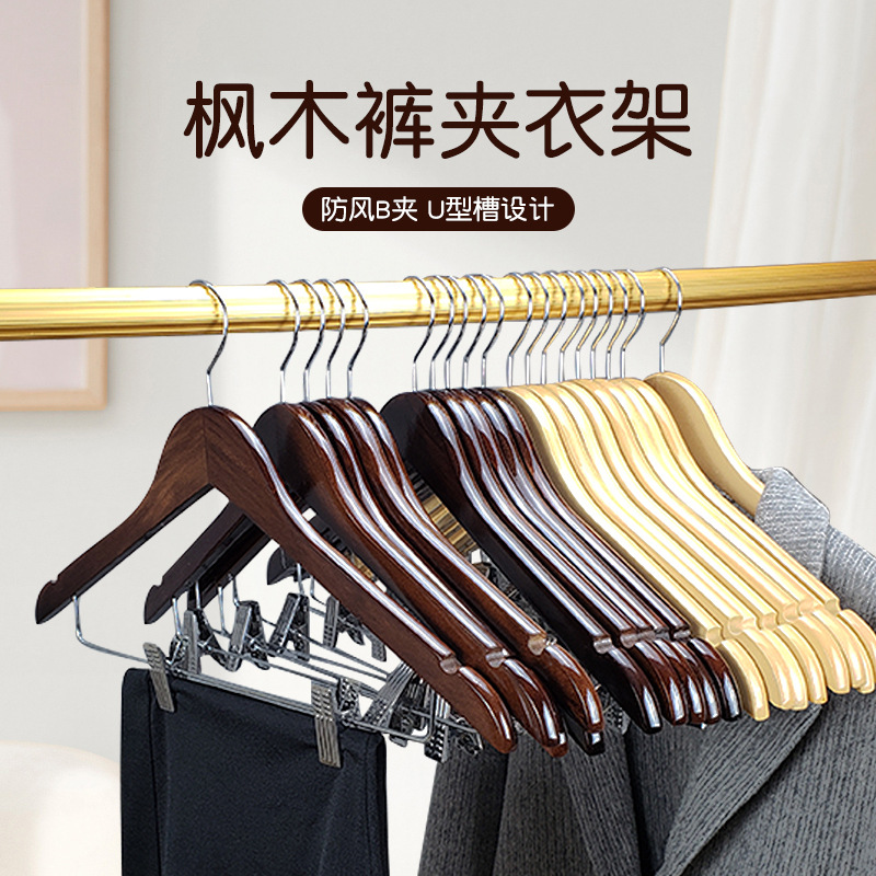 现货原木色B夹实木质衣架批发 服装店酒店成人晾挂衣架带裤夹工厂