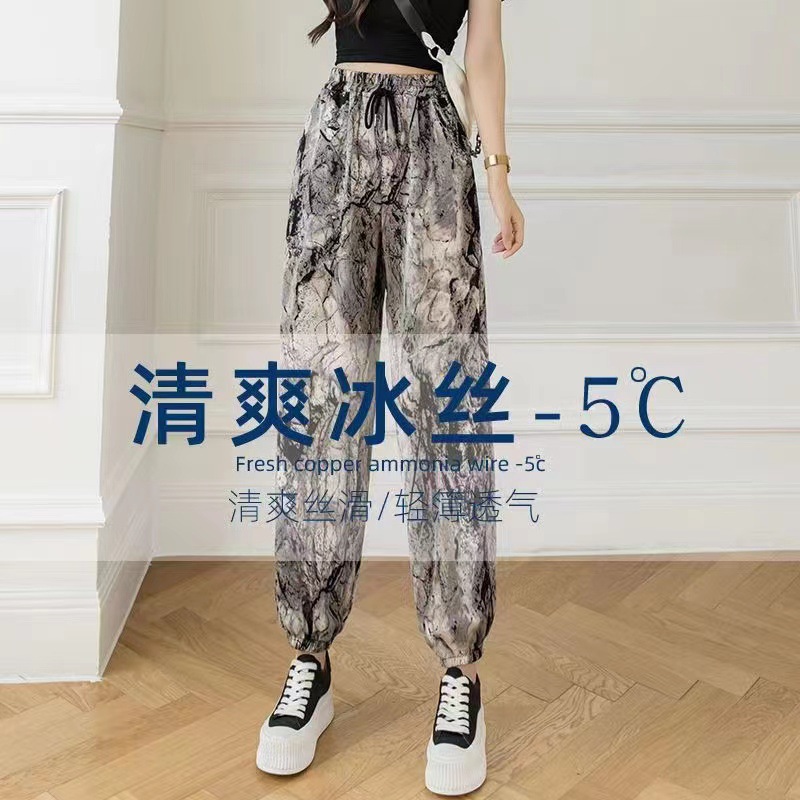 冰丝束脚裤女夏薄款高腰宽松雪纺凉凉哈伦裤防蚊小脚裤花裤休闲裤