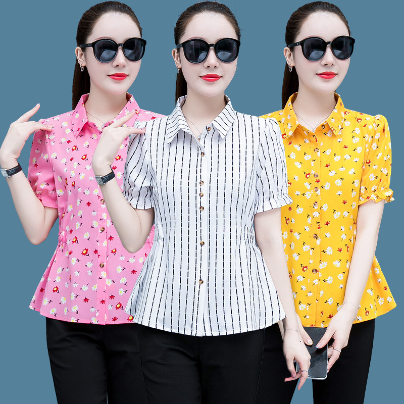 印花衬衫女短袖春夏新款2023韩版修身雪纺衫大码洋气衬衣