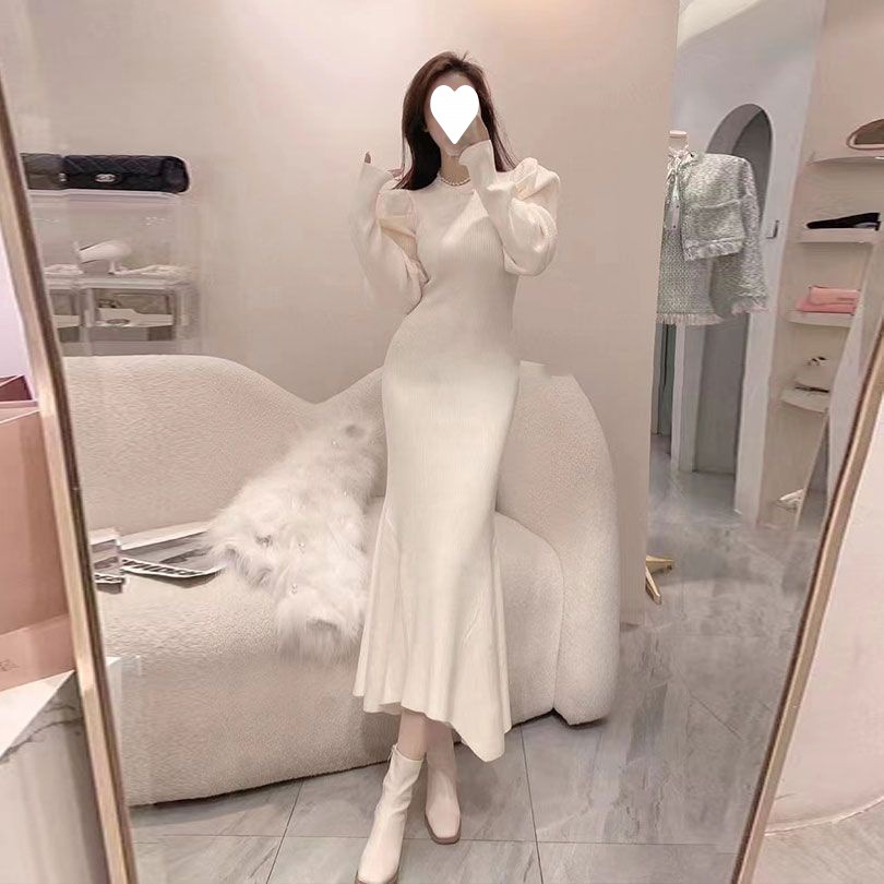 泡泡袖不规则下摆鱼尾连衣裙女2022秋冬新款法式套头长袖针织裙欧