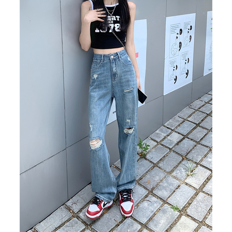 破洞牛仔裤女夏季2023新款美式高街风设计感高腰显瘦阔腿直筒长裤