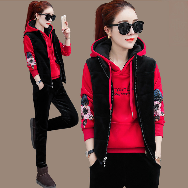 加绒加厚运动套装女秋冬新款保暖金丝绒长袖卫衣休闲服三件套
