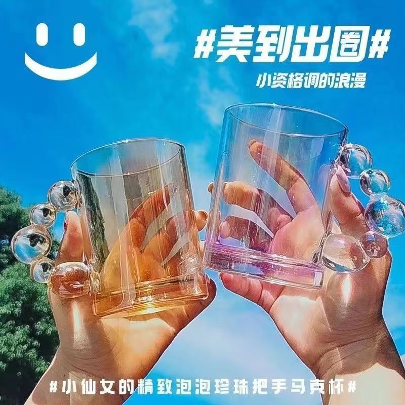 网红ING风汽泡玻璃杯简约水杯珍珠把手牛奶杯咖啡杯啤酒杯饮料杯