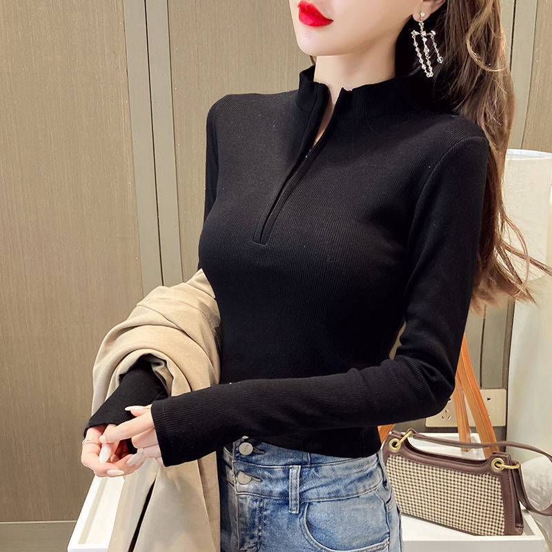 慵懒风高腰长袖恤女拉链短款修身新款上衣潮内穿外穿气质打底衫~