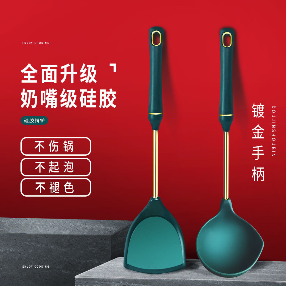 不起泡硅胶锅铲镀金304不锈钢厨具烹饪工具厨房用具炒菜家用餐厅