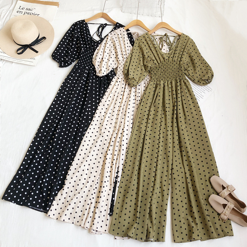 早春新款甜美气质V领波点高腰系带泡泡短袖阔腿长裤连体裤女