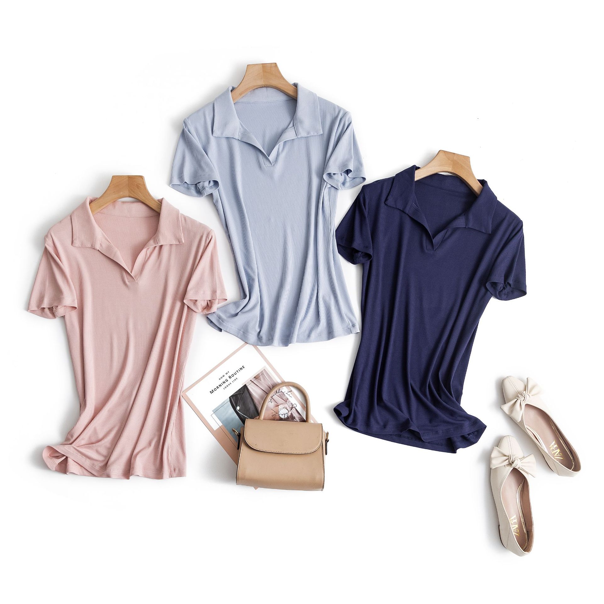 螺纹免烫翻领POLO短袖T恤女2021春夏新款修身显瘦纯色半袖体恤