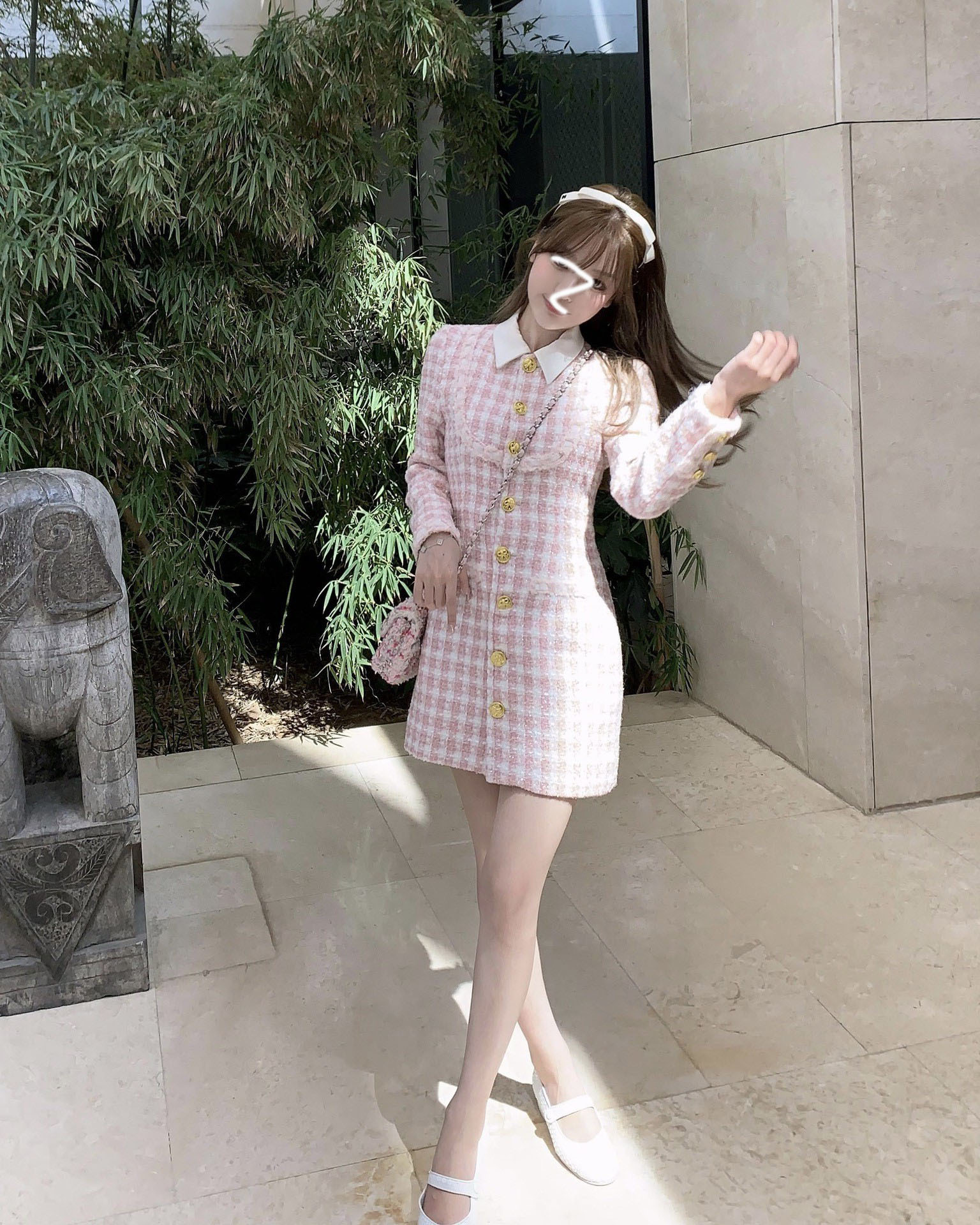 小香风格子连衣裙秋季新款年法式复古撞色翻领显瘦粗花呢裙子