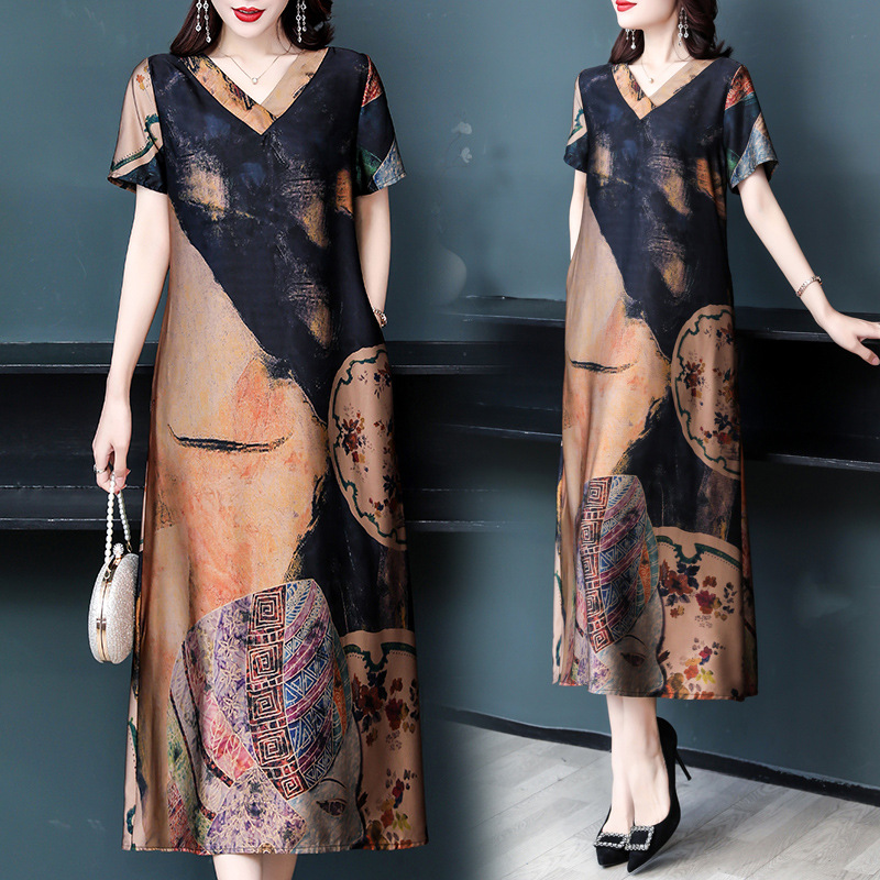 杭州丝绸真丝连衣裙香云纱女装清仓特价印花宽松大码气质桑蚕丝裙