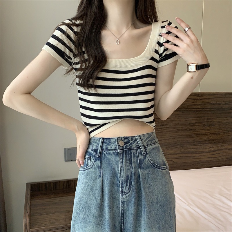 条纹连衣裙2022夏季新款港味复古方领女修身显瘦性感包臀辣妹短裙