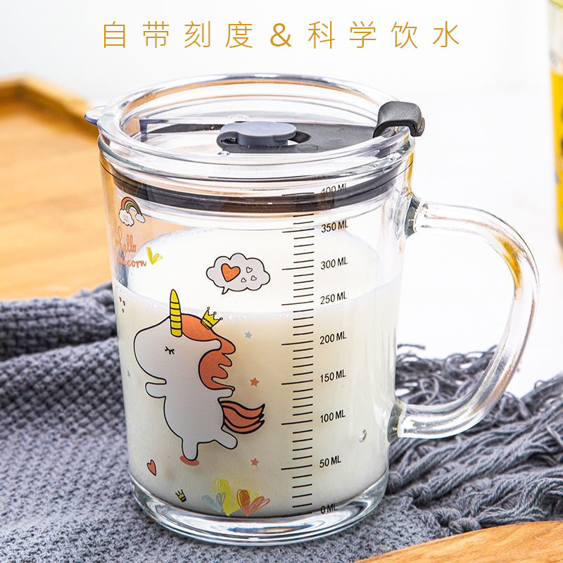 加厚玻璃儿童牛奶杯带刻度吸管杯子家用果汁饮料奶粉卡通带盖水杯