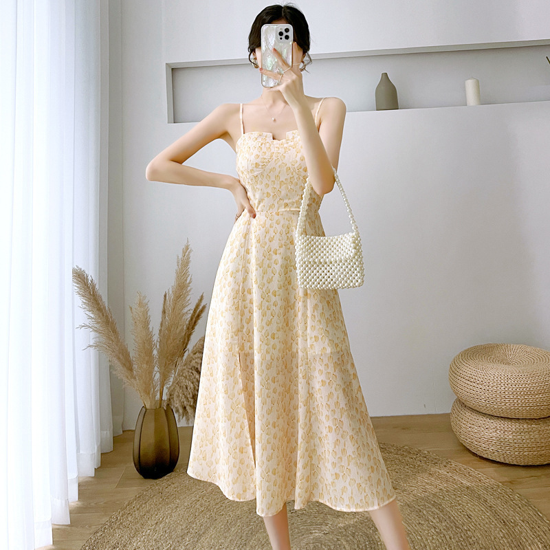 茶歇法式气质显瘦雪纺吊带连衣裙女夏季甜美气质修身显瘦开叉长裙