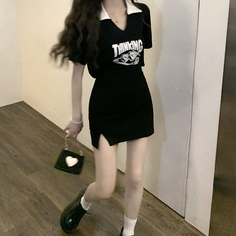 领连衣裙女春季2023新款甜酷辣妹小心机露腰显瘦开叉短袖裙子