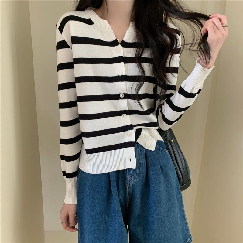 条纹针织开衫长袖正肩t恤女秋冬宽松气质百搭短款上衣设计感小众
