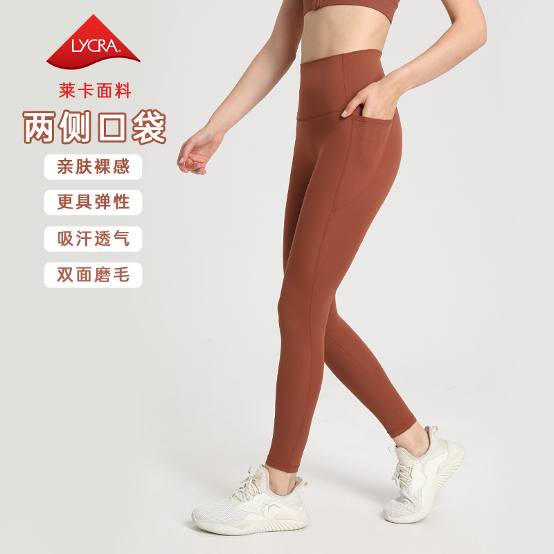 莱卡双面磨毛运动健身裤裸感蜜桃臀无尬高腰口袋紧身裤lulu瑜伽裤