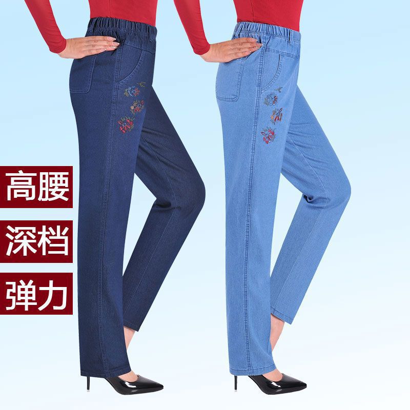 春夏薄款中老年女牛仔裤弹力高腰松紧妈妈长裤宽松大码直筒女裤子