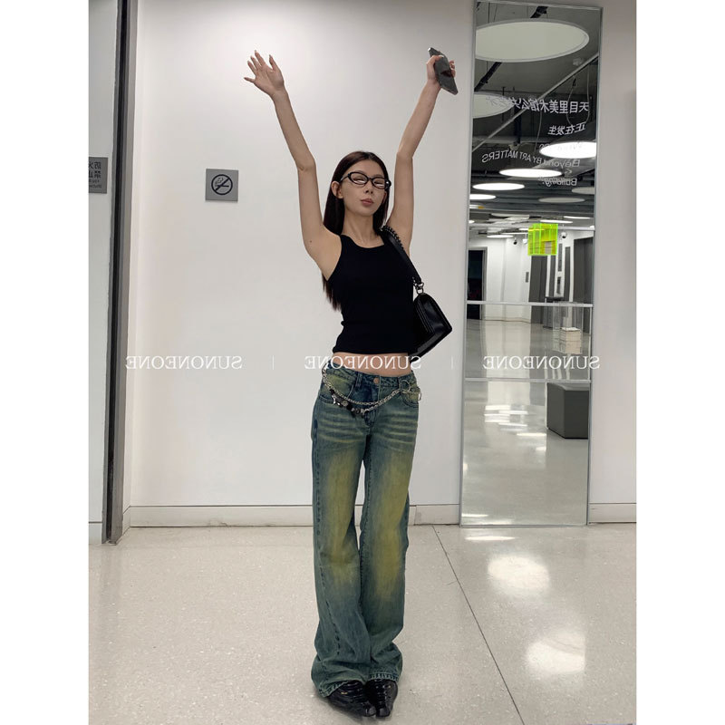 SUN11 复古做旧磨黄牛仔裤女春秋季设计感小众宽松显瘦直筒裤