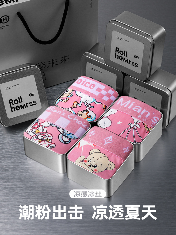冰丝粉色内裤男士潮流卡通裤薄款男生四角夏季平角可爱大码短裤头