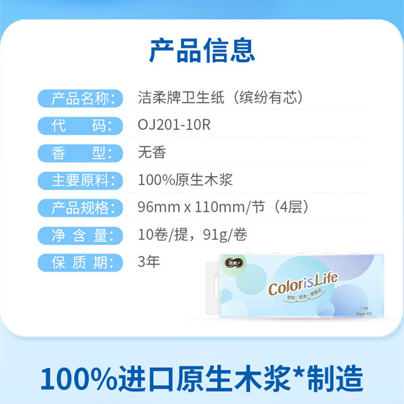洁柔缤纷有芯卷筒卫生纸4层910克 10卷单提卷纸宾馆酒店用纸OJ201