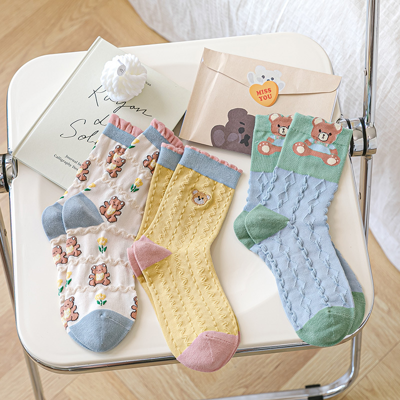 中筒袜女夏季新款薄款纯棉袜子刺绣小熊松口夏天诸暨袜少女高筒袜