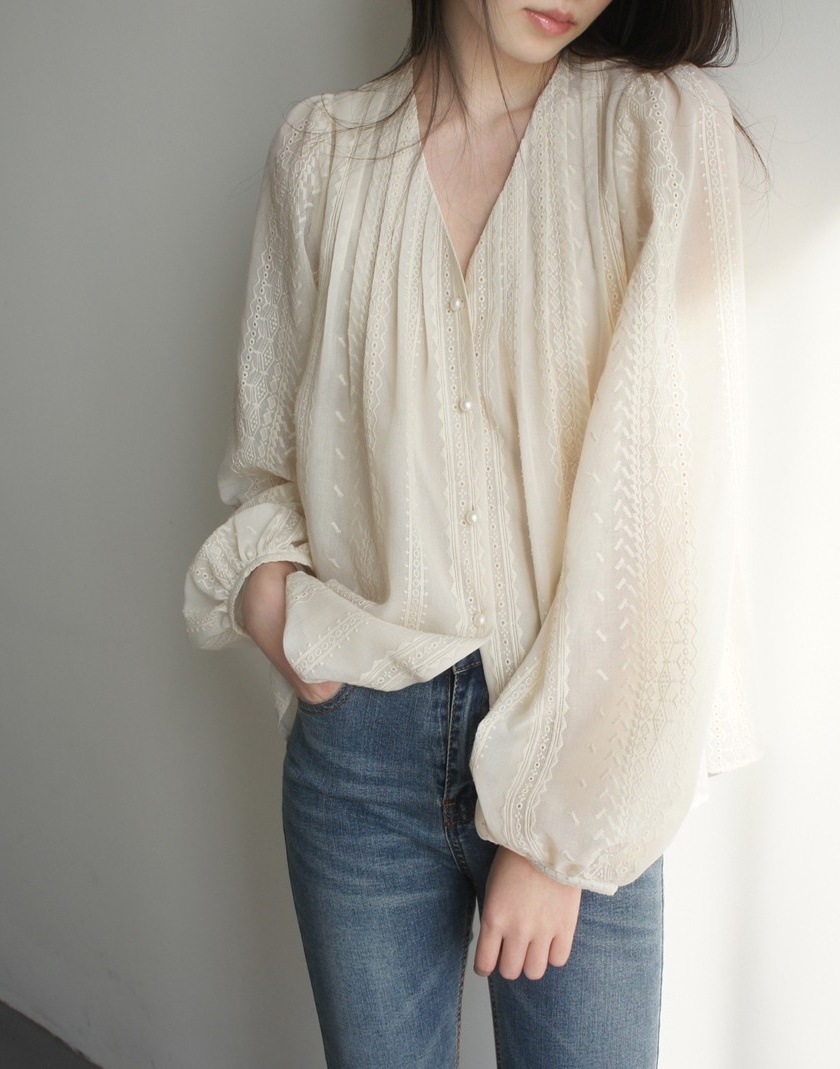 春秋法式复古奶油杏温柔蕾丝灯笼袖衬衫女设计感小众宽松领衬衣