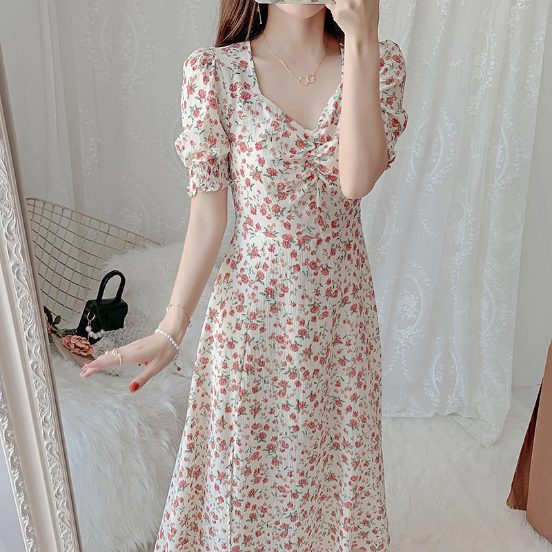 温柔风法式碎花连衣裙女新款夏季性感收腰开叉泡泡袖雪纺长裙