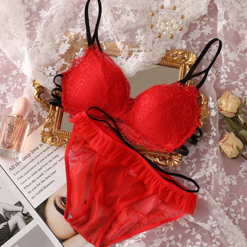 性感蕾丝绑带本命年大红色婴儿棉结婚新娘文胸上托小胸专用内衣裤