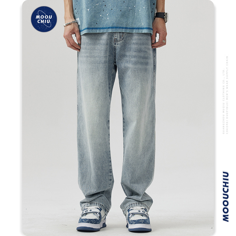 沐丘男装∣春季美式高街复古牛仔裤男潮牌宽松垂感直筒浅色阔腿裤
