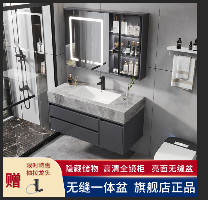 现代简约岩板陶瓷无缝一体盆浴室柜组合智能镜柜款卫生间洗漱台盆