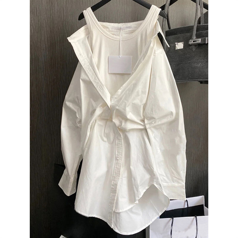 韩国东大门春装新款设计感不规则露肩长袖假两件衬衫裙子连衣裙女