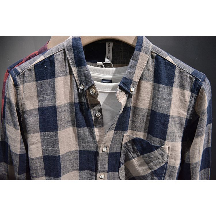 文艺青年英伦风拼色格子衬衫男士潮流休闲港式亚麻棉长袖上衣春秋