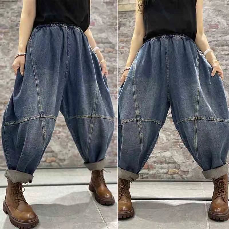早春款水洗磨白牛仔哈伦裤女大码松紧腰遮肉阔腿裤显瘦老爹裤