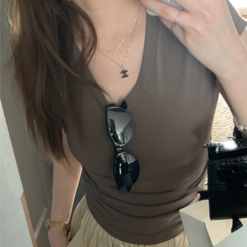 HEYGIR黑哥 白丁艺术家 V领收腰显瘦抽褶T恤女春夏内搭简约上衣