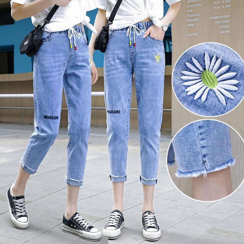 松紧腰牛仔裤七分裤女春夏2023新款韩版百搭高腰小脚哈伦九分裤秋