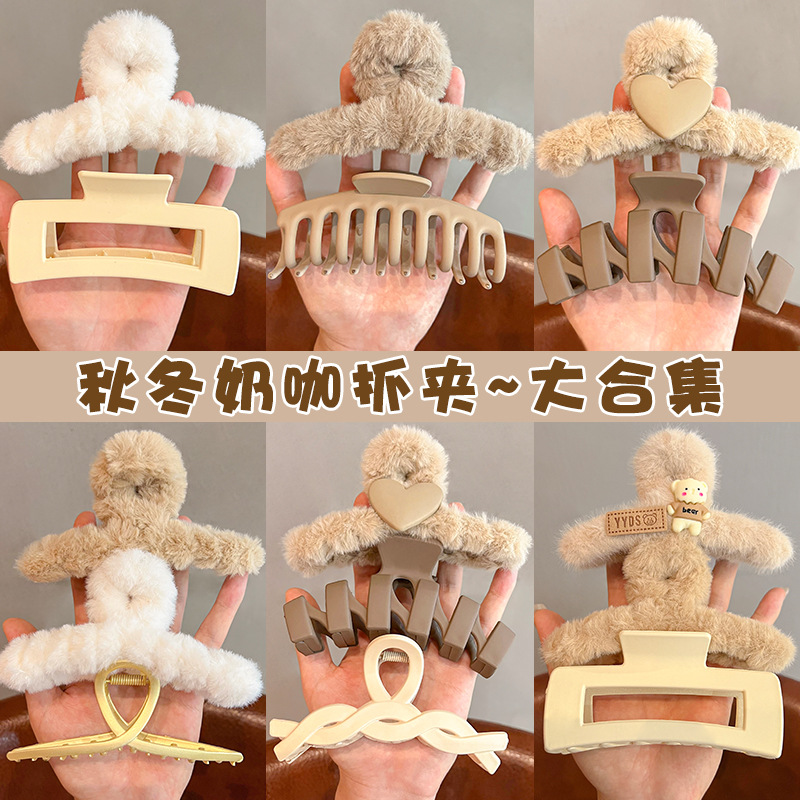 可爱小熊毛绒抓夹女款后脑勺盘发夹子大号鲨鱼夹秋冬儿童发卡头饰