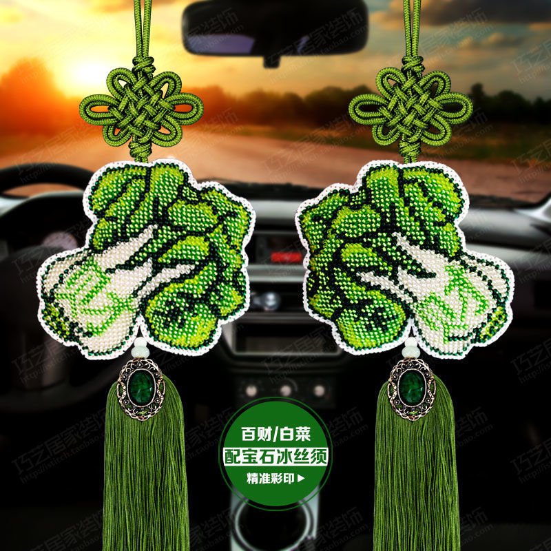 百财/玉白菜双面十字绣珠绣车挂新款绿色印花珠绣平安符车挂