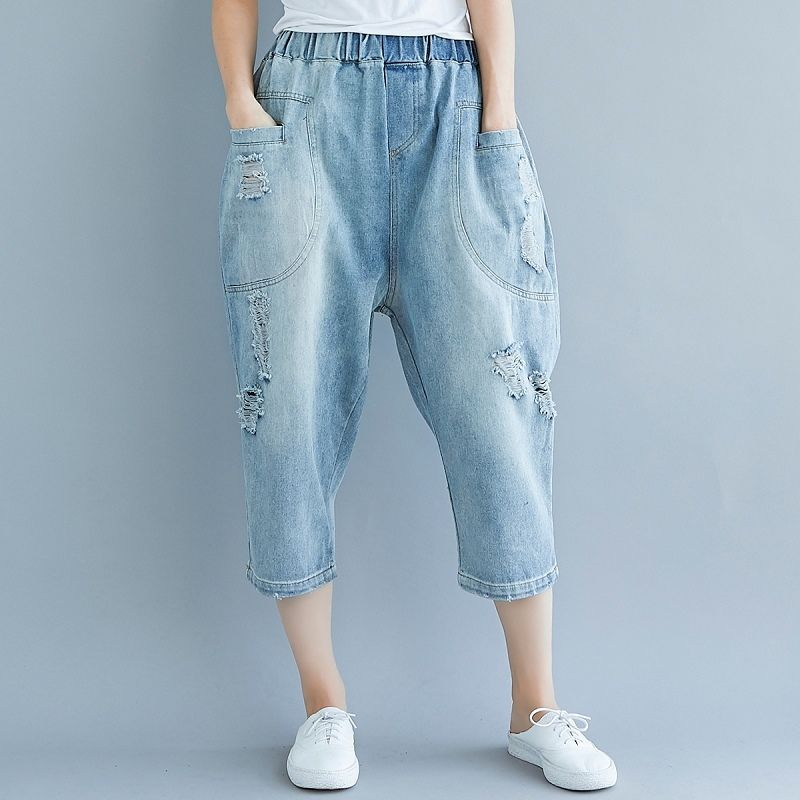 夏薄款韩版加肥加大码女装休闲牛仔裤胖mm破洞牛仔九分哈伦裤垮裤