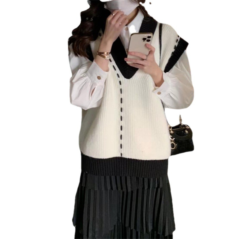 针织背心叠穿上衣秋季复古撞色v领毛衣马甲女套头宽松外搭慵懒风