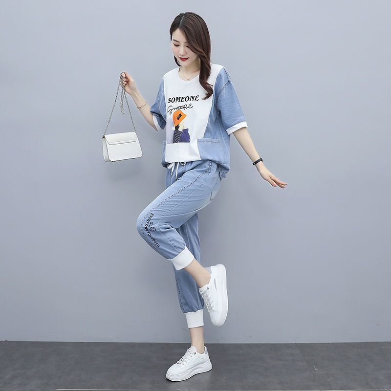 夏季休闲时尚牛仔套装2023年新款女爆款网红职业两件套洋气减龄裤